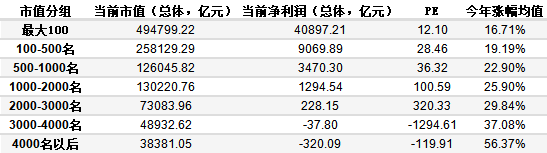 自去年9月份以来,市场风格与之前有了很大的转换,大盘价值从上一阶段相对收益率最好变为相对收益率最差,小盘成长的相对收益率阶段性最好。从下表不难看出,今年以来市场表现与市值大小还是呈现比较明显的负相关性。A股中小市值的公司整体有很明显的超额收益,对于这些公司,明年是否可以继续获得超额收益?见仁见智!