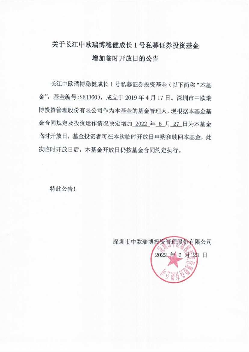 关于长江中欧瑞博稳健成长1号私募证券投资基金增加临时开放日的公告