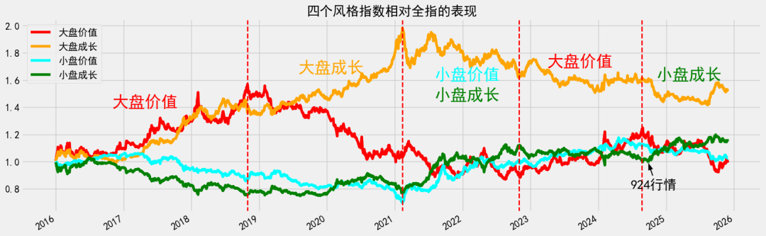 2025年,A股市场中,量化型的产品业绩突出,受到市场上各路资金纷纷追捧,大多数基本面主观管理型的基金管理规模,今年都遭到一定程度的净赎回。从我们内部量化数据分析来看,今年市场中小市值因子明显有很好的超额表现。而这些高估值的小市值股,在2019-2021年结构型牛市中,表现是远远跑不赢大市值的蓝筹股的。在2023—2024年初这段时间,也是没有跑赢大盘价值股的。多年的投资生涯告诉我们,没有一种投资策略会长期有效,每一种投资策略的最优表现都是阶段性的。下图是我们量化部门对于大小票因子,成长与价值因子在过去10年间风格轮动做了一个统计。